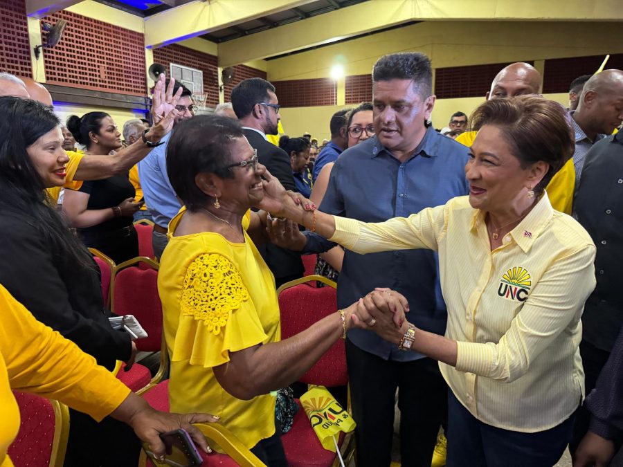 Caption: Political Leader of the UNC and Prime Minister Kamla Persad-Bissessar greets at supporter on Monday. Photo: Facebook …