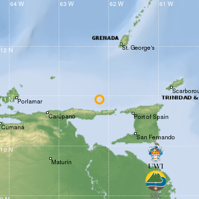 It was recorded 80 km NW of Port of Spain, 105 km WNW of Arima and 110 km NW of San Fernando.