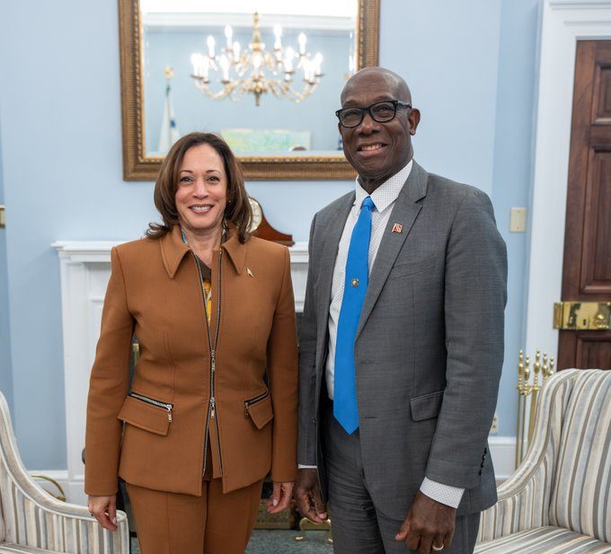 Caption: US Vice President Kamala Harris with Prime Minister Dr Keith Rowley. Photo/X account of Kamala Harris