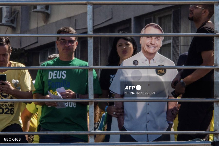 Caption: Brazil’s senator Flavio Bolsonaro, left, stands next to an image of his father, former Brazilian President Jair Bolsonaro, during a demonstration in his favor at Copacabana Beach in Rio de Janeiro, Brazil on August 3, 2025