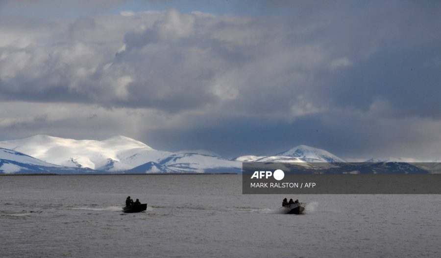 Caption: Hunters return from a trip searching for geese and ducks near the town of Quinhagak on the Yukon Delta in Alaska on April 12, 2019