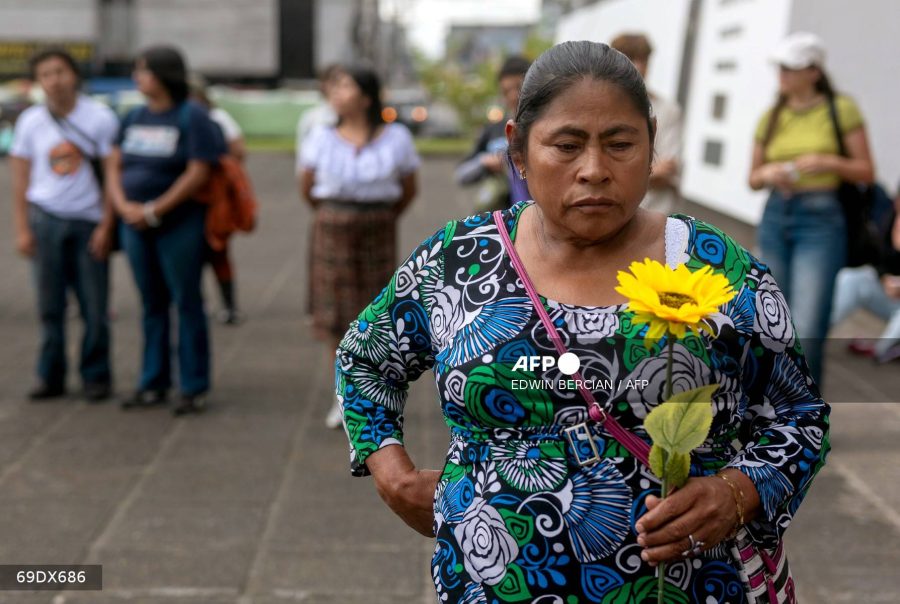 Caption: A relative of victims holds a flower during the sentencing hearing for the 2017 orphanage fire that killed 41 adolescent girls in Guatemala City
