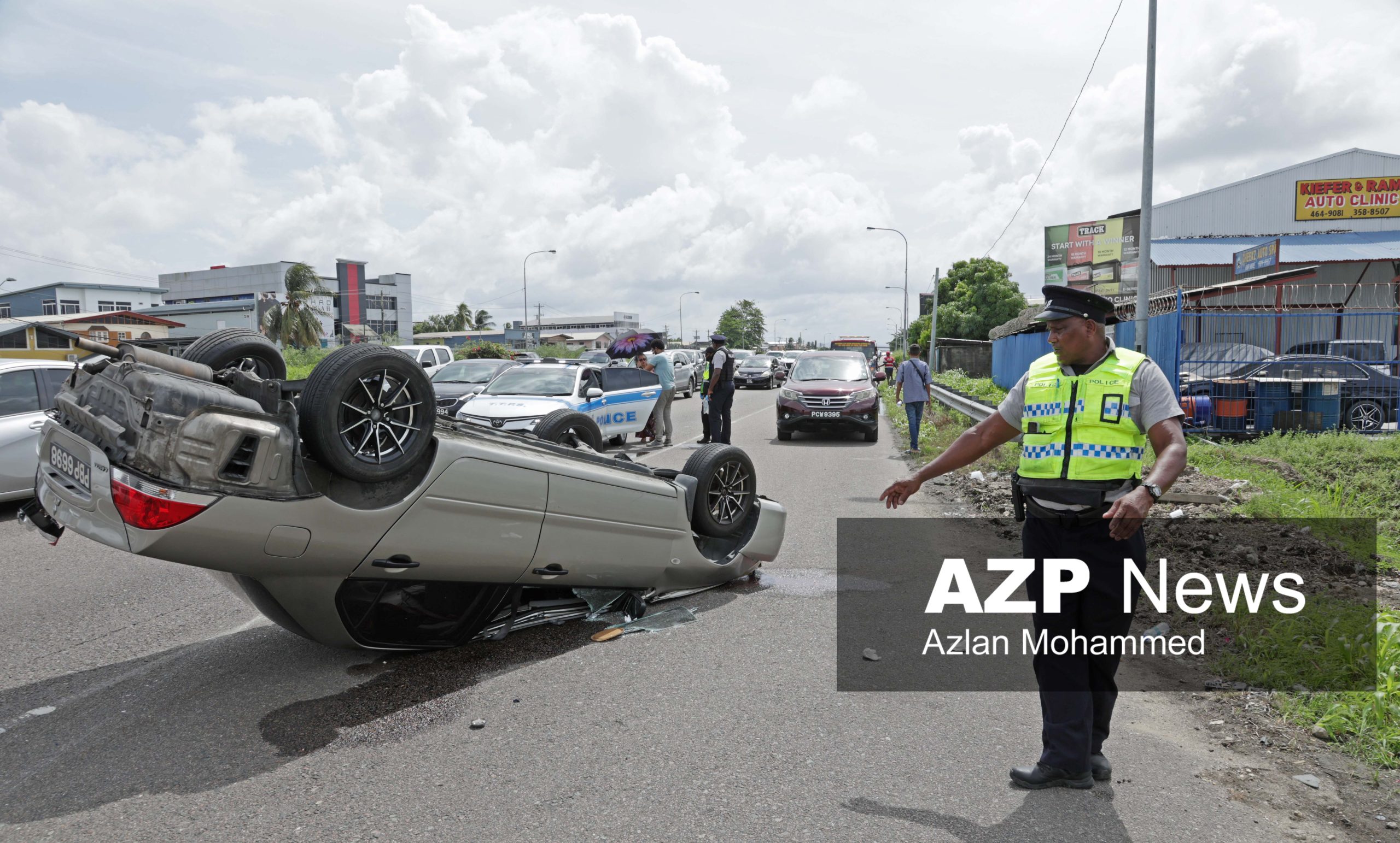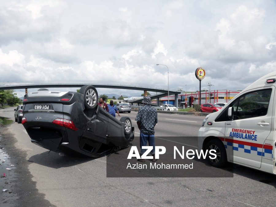 Caption: An ambulance on the scene of two cars that flipped along the northbound lane of the Uriah Butler Highway on Sunday