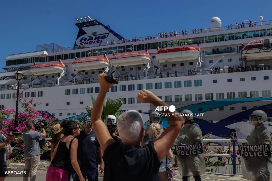 Caption: Greek riot police stand guard as pro-Palestinian demonstrators protest against the arrival of the ‘Crown Iris’, a cruise liner carrying Israeli tourists, in Agios Nikolaos on the island of Crete, on July 29, 2025.
