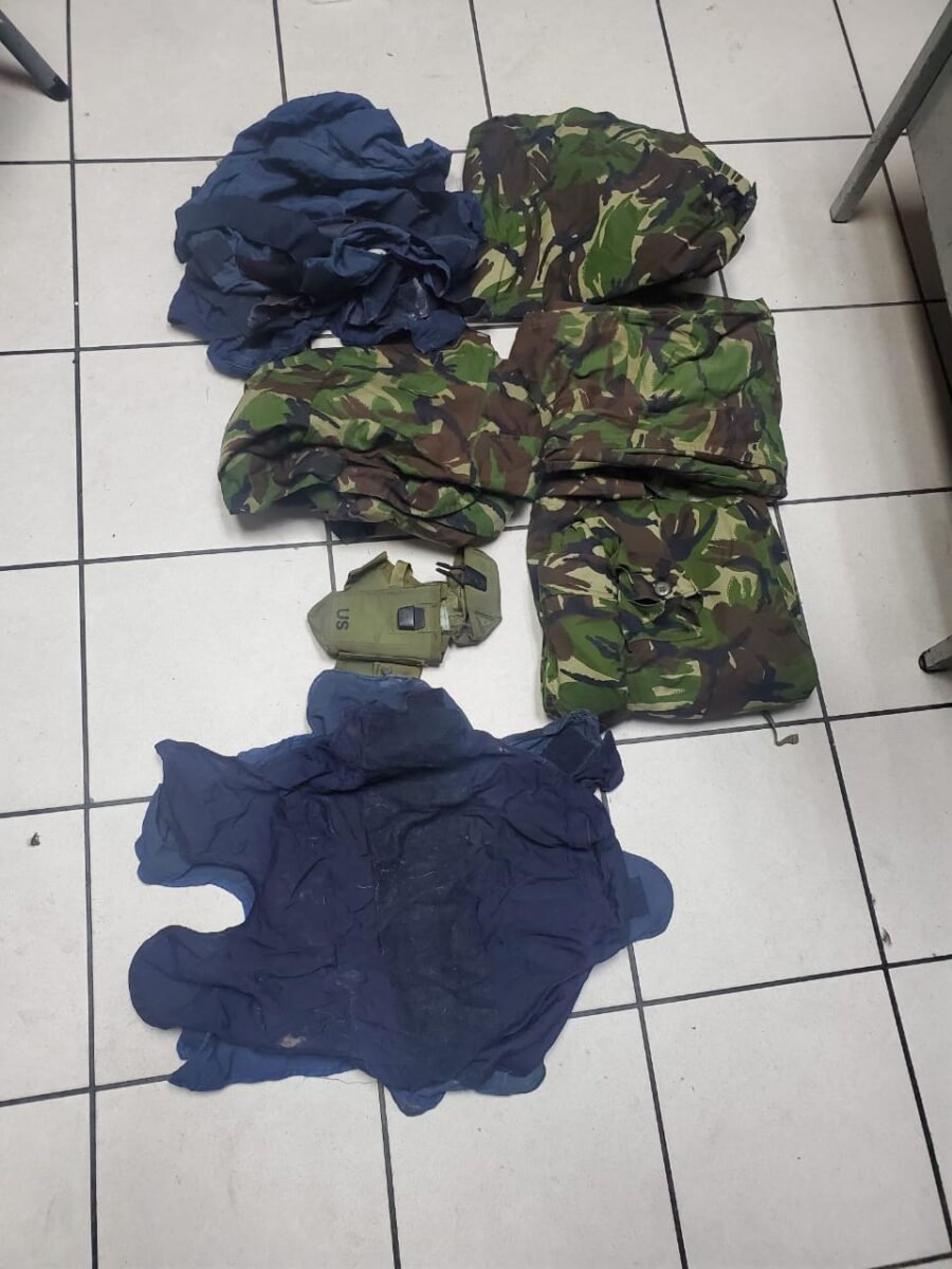 The officers discovered a WT holster, two green camouflage jackets, two green camouflage long pants, four outer housing for bulletproof vests, and a black revolver with yellow electrical tape. The items were removed.