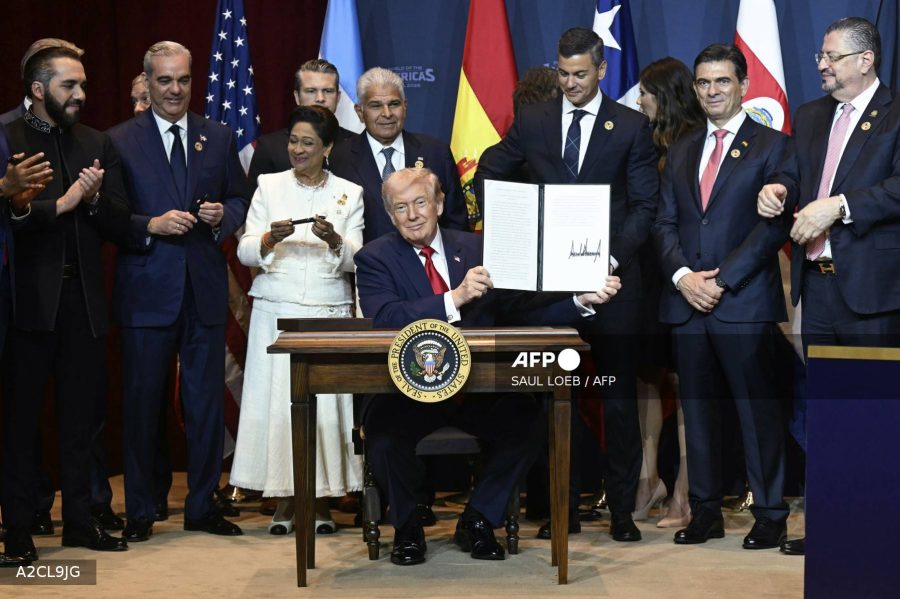US President Donald Trump hands a pen after signing a proclamation at the Shield of the Americas Summit …