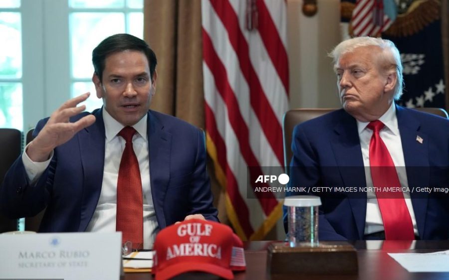 Caption: US President Donald Trump listens as US Secretary of State Marco Rubio speaks during a Cabinet meeting …