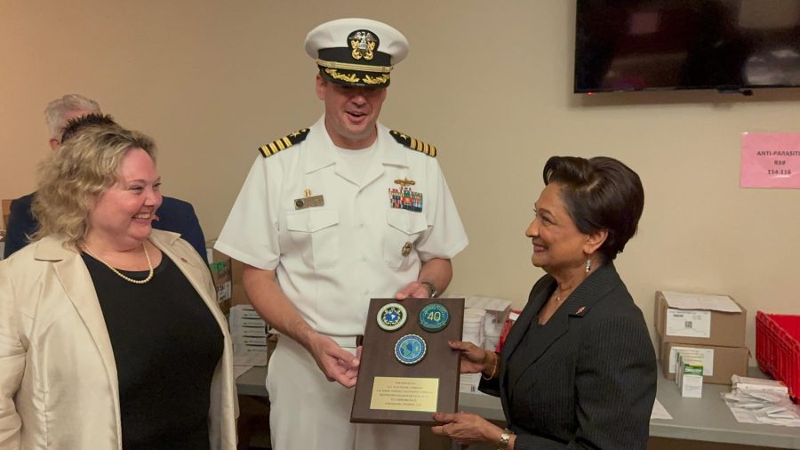 Caption: Prime Minister Kamla Persad-Bissessar, right, with US Embassy Chargé d’Affaires, Jenifer Neidhart de Ortiz, left, on board …
