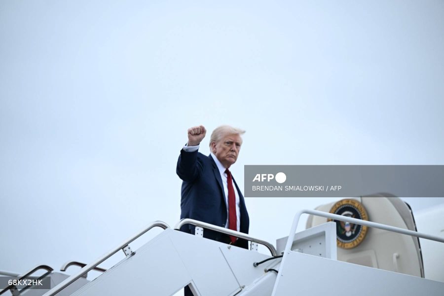 Caption: US President Donald Trump pumps his fist as he boards Air Force One at Joint Base Andrews, …