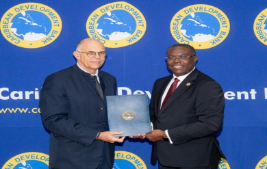 Caption: CDB’s Vice President, Operations, Dr. Isaac Solomon, right, and Dominique Hautbergue, Director for the Brazil-Southern Cone Region, …