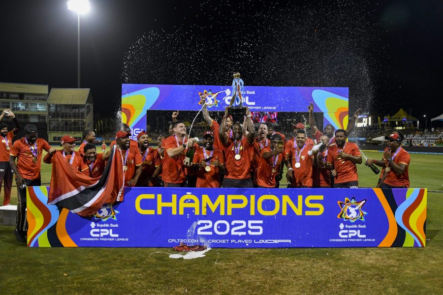 Caption: Prime Minister Kamla Persad-Bissessar holds the CPL trophy with the TRK team. AZP News/Alicia Chamely By Alicia …