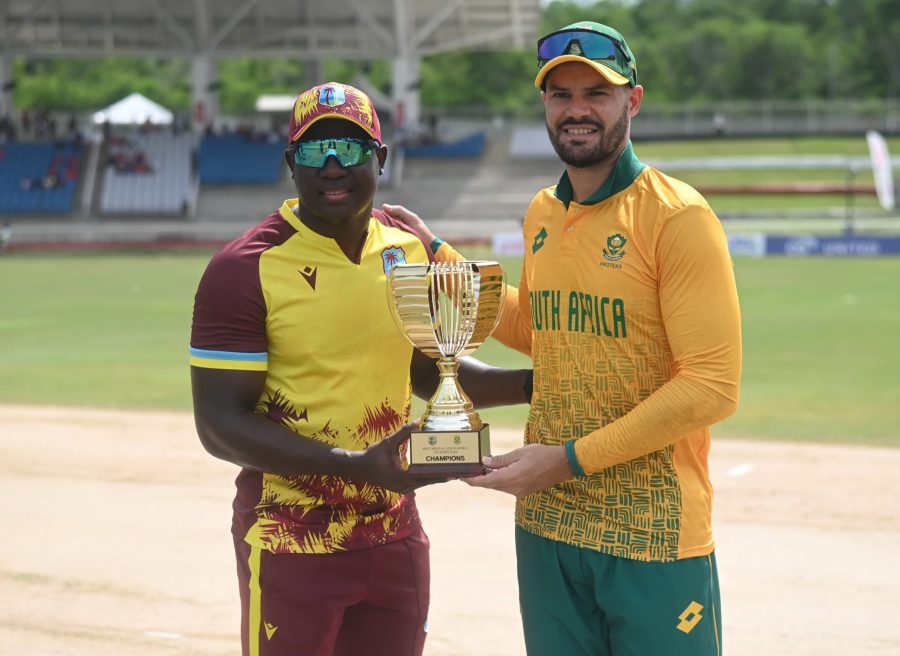 Caption: West Indies captain Rovman Powell, left, and South African skipper Aiden Markram with the 2024 series T20I …