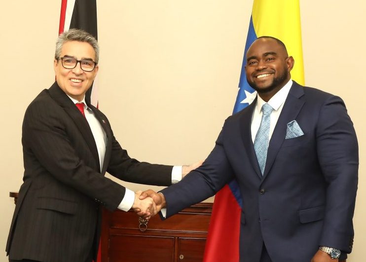 Caption: Venezuelan Ambassador to Trinidad and Tobago Álvaro Sánchez Cordero, left, and Minister of Foreign and Caricom Affairs …