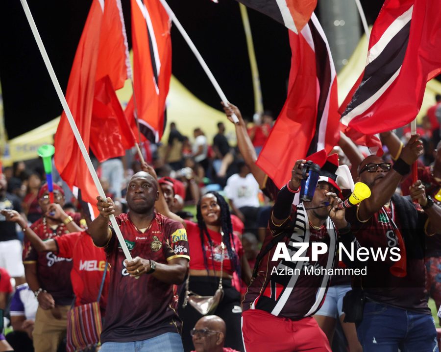 Caption: Fans at the Caribbean Premier League wave Trinidad and Tobago flags at the Brian Lara Cricket Academy …