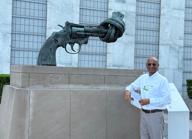 Caption: Vijai Sadal at the Peace Monument outside the United Nations building in New York By Vijai Sadal …
