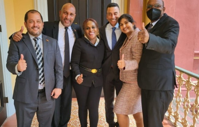 Caption: UNC Senators, From left are Damien Lyder, Anil Roberts, Jerlean John, David Nakhid, Jayanti Lutchmedial and Wade …