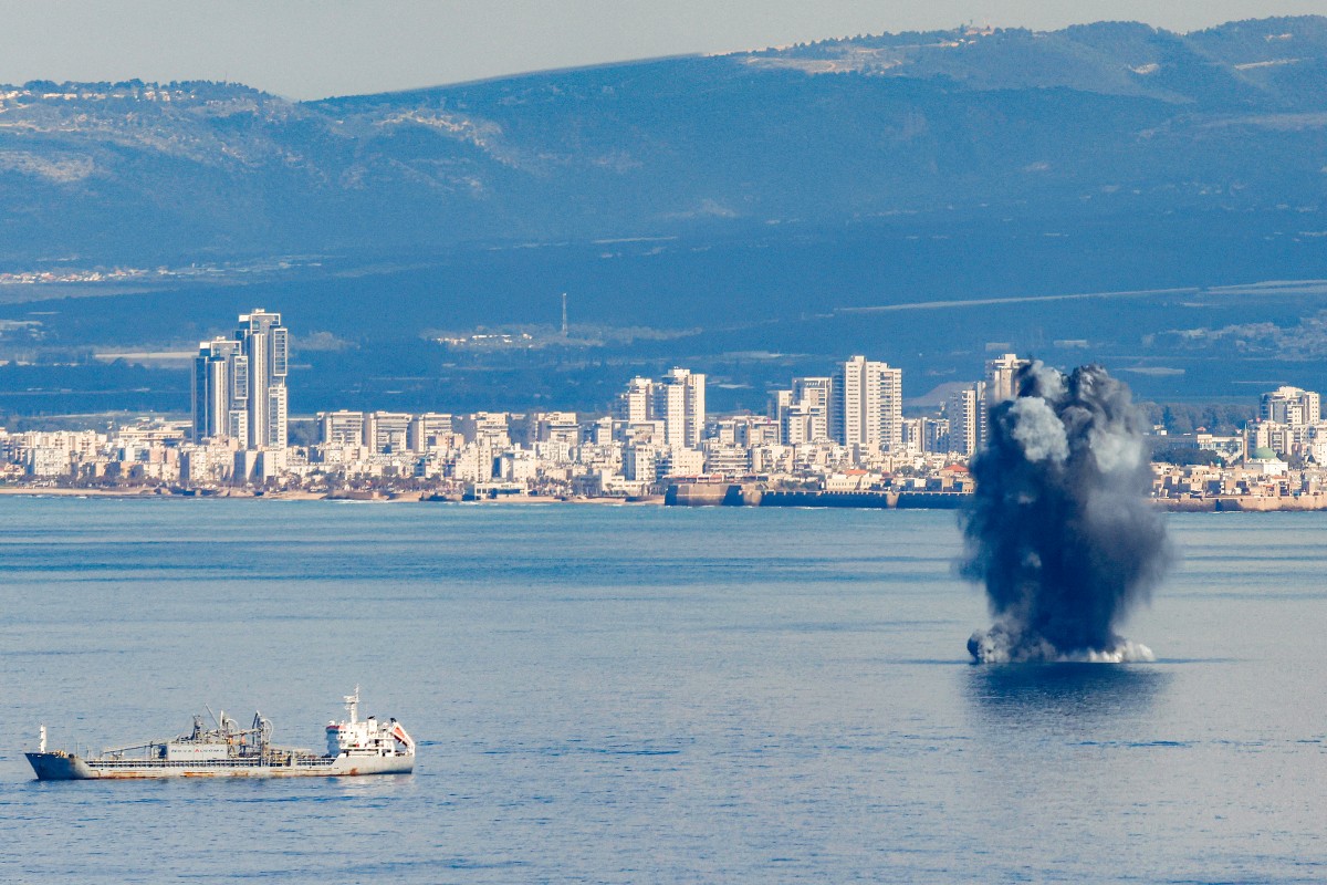 Caption: An incoming projectile explodes over the water in the bay of Haifa off of the northern Israeli …