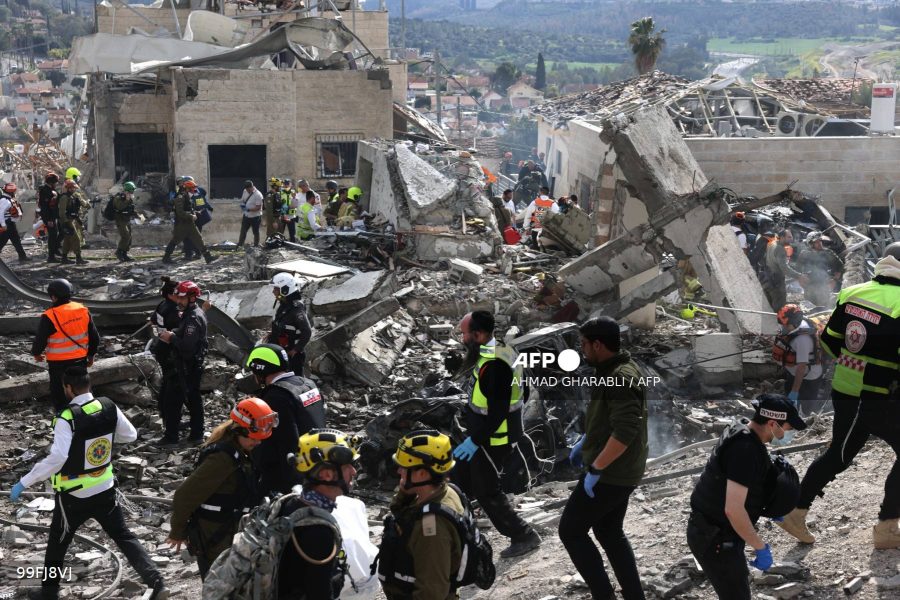 Caption: Israeli emergency service officers search the scene of a missile attack near Bet Shemesh, some 30 kilometres …