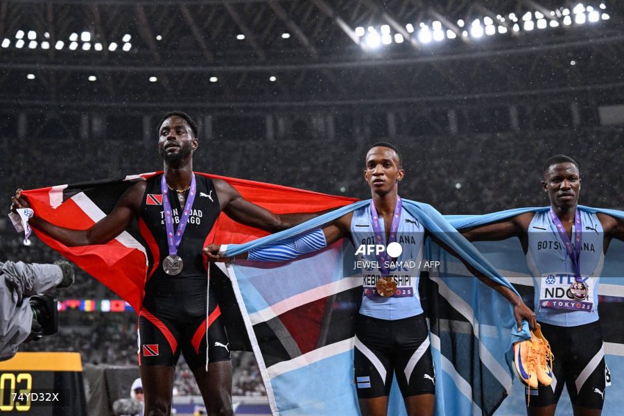 Caption: Second placed Trinidad and Tobago's Jereem Richards, First placed Botswana's Busang Collen Kebinatshipi and Third placed Botswana's …