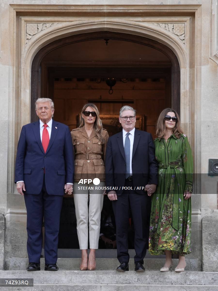 Caption: Britain's Prime Minister Keir Starmer, seocnd right, and Victoria Starmer, right, bid farewell to US President Donald …