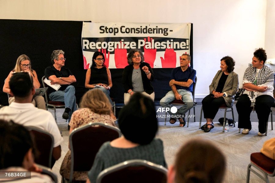 Caption: Israeli Arab Member of Parliament (Knesset) Aida Touma-Sliman, centre, attends with other activists a press conference under …