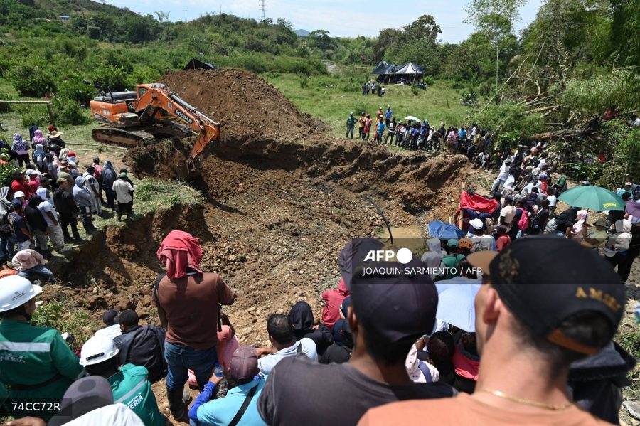 Caption: People look at an excavator working at the site where an illegal gold mine collapsed with seven …