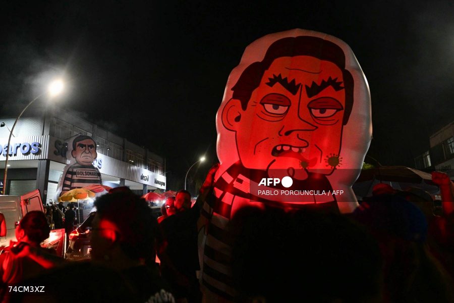 Caption: This view shows giant inflatable dolls depicting former Brazilian President (2019-2022) Jair Bolsonaro dressed as prisoner a …