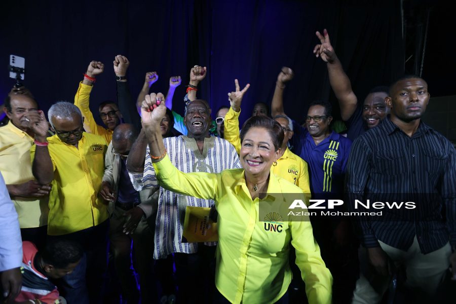 Political Leader of the UNC Kamla Persad-Bissessar celebrates victory at the party headquarters in Chaguanas on Monday night. …
