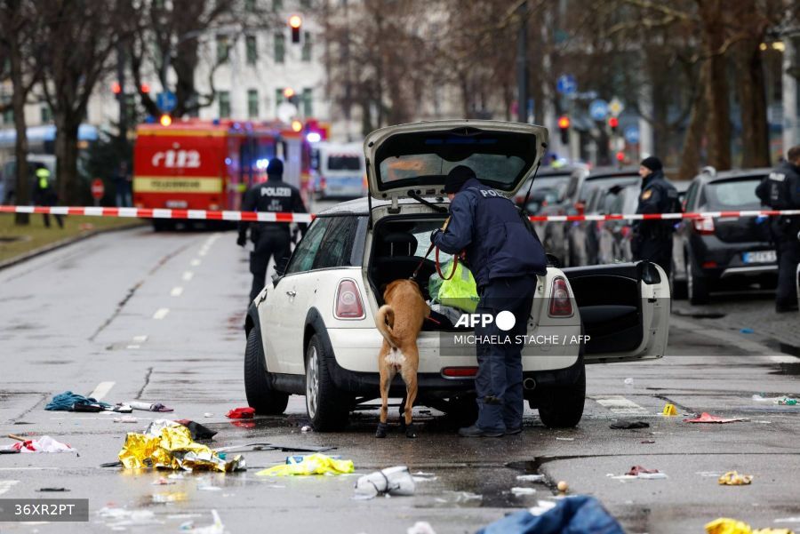 Caption: A police officer uses a dog to search the car at the scene where a man drove …