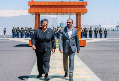 Caption: Barbados Prime Minister Mia Mottley, left, is greeted by Prime Minister of Ethiopia Abiy Ahmed on arrival …
