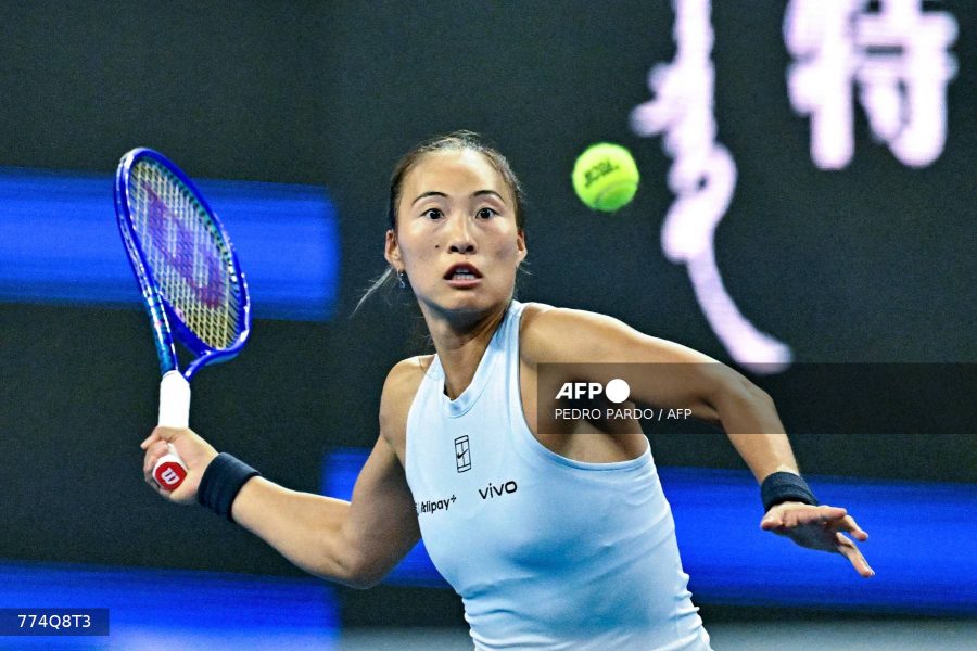 Caption: China’s Zheng Qinwen hits a return to Czech Republic’s Linda Noskova during their women’s singles match at …