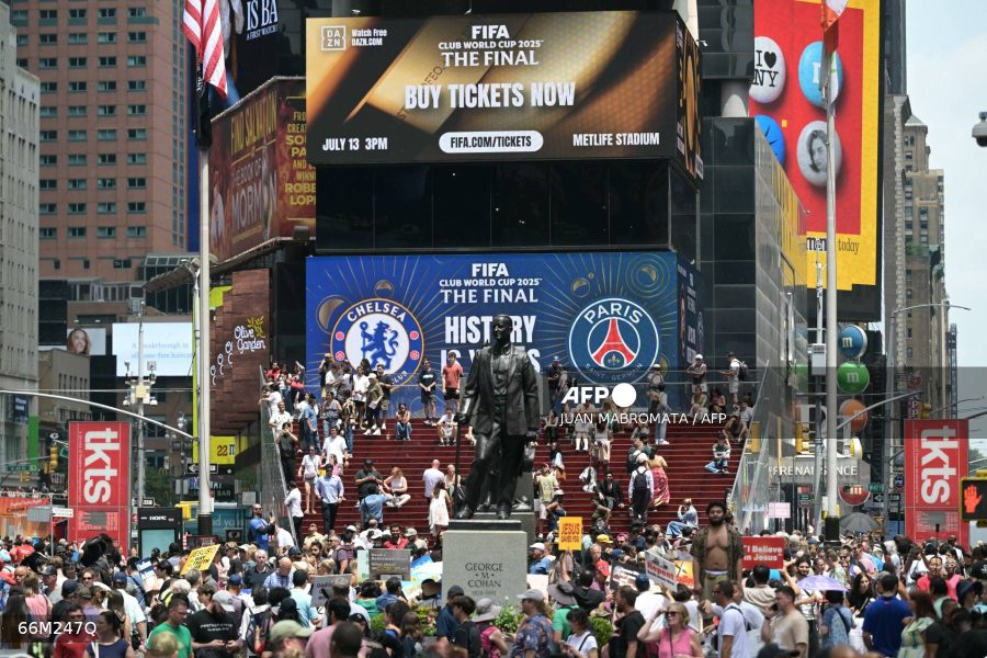 Caption: Advertising for the FIFA Club World Cup final match between France’s Paris Saint-Germain and England’s Chelsea is …