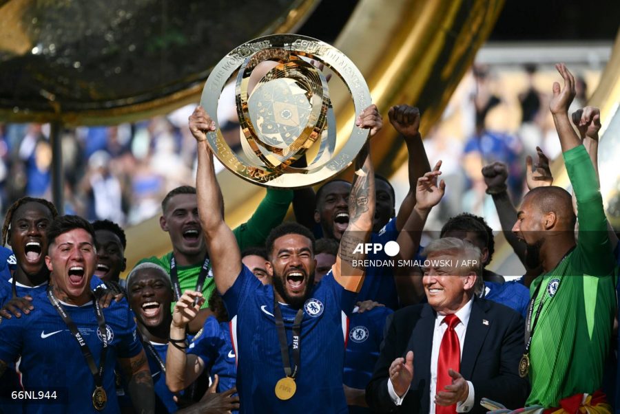 Caption: Chelsea's English defender Reece James lifts the trophy as teammates and US President Donald Trump cheer during …