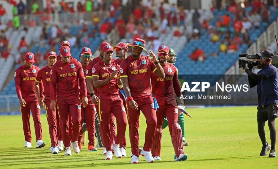 Caption: Victorious West Indies players leave the field West Indies 294 for 6 (Hope 120 not out, …