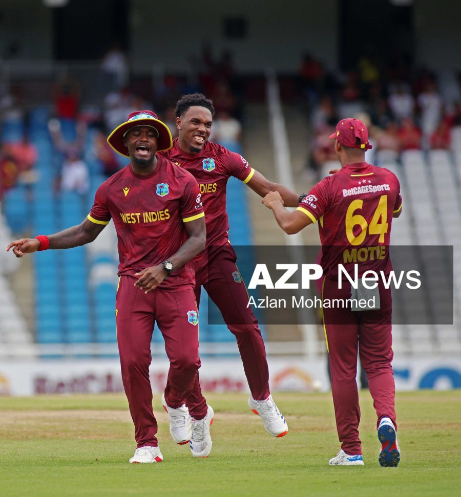 Caption: Jediah Blades celebrates a wicket with Jayden Seales and Gudakesh Motie TAROUBA - Led by standout …