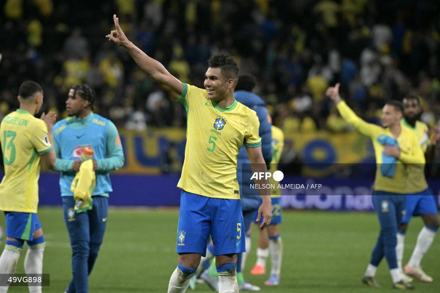 Caption: Brazil's midfielder Casemiro celebrates after winning the 2026 FIFA World Cup South American qualifiers football match between …