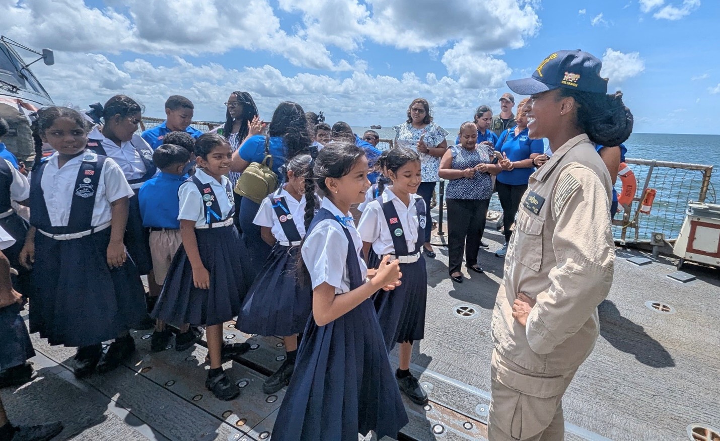 The exclusive ship tour, hosted by Gravely’s sailors and leadership, followed recent infrastructure upgrades and donations to the school funded by United States Southern Command (USSOUTHCOM). The upgrades, completed in August 2025 during Operation Continuing Promise and the USNS Comfort visit to Trinidad and Tobago, included structural repairs and improvements to water, sewage, and electrical systems, carried out by Navy Seabees (U.S. Naval Construction Battalion Sailors).