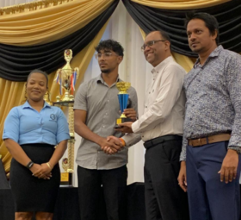 Caption: Chairman of the Central Zone Kellman Kowlessar, second right, presents the second-place trophy for the Evolution 40-Over Competition to Ubaidullah Abdoel of Balmain United while Kimberly Hercules of Evolution Fitness, and Sunil Moonasar of Island Roofing looks on