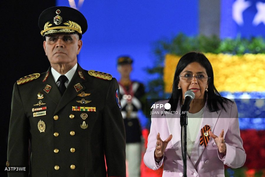 Caption: Venezuela’s Vice-President Delcy Rodriguez (R) speaks next to Venezuelan Defence Minister General Vladimir Padrino Lopez during a military parade at the inauguration of Victory Square, commemorating the 80th anniversary of the Soviet Union’s victory over Nazi Germany in World War Two (WWII), in Caracas on May, 13, 2025