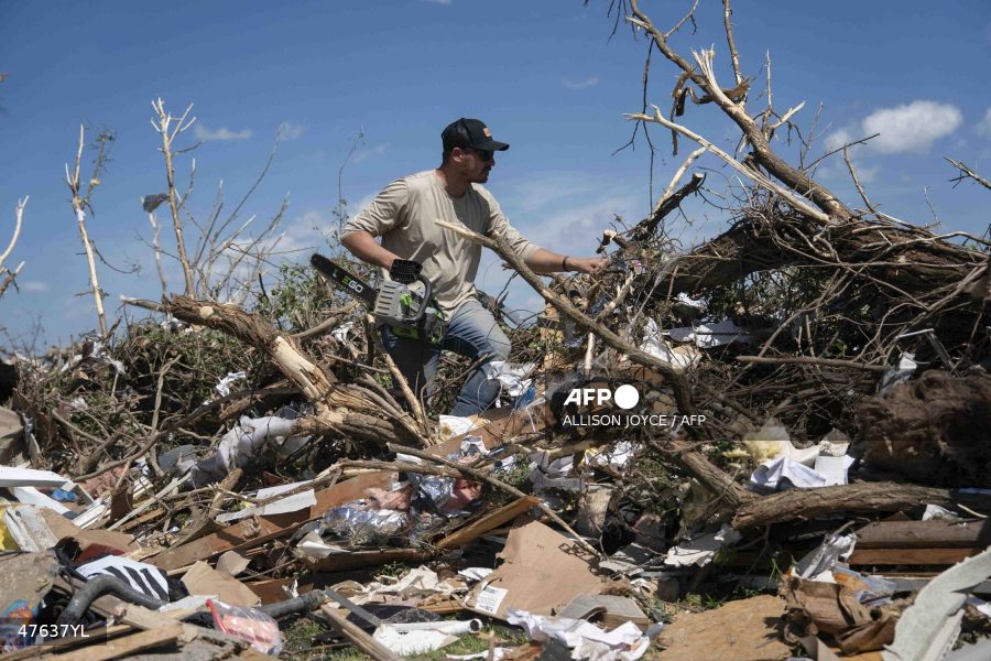 Caption: A person clears debris from a tornado in London, Kentucky, on May 17, 2025. More than 20 people have died after severe storms swept through the southern US states of Missouri and Kentucky, officials and local media reports said May 17, 2025