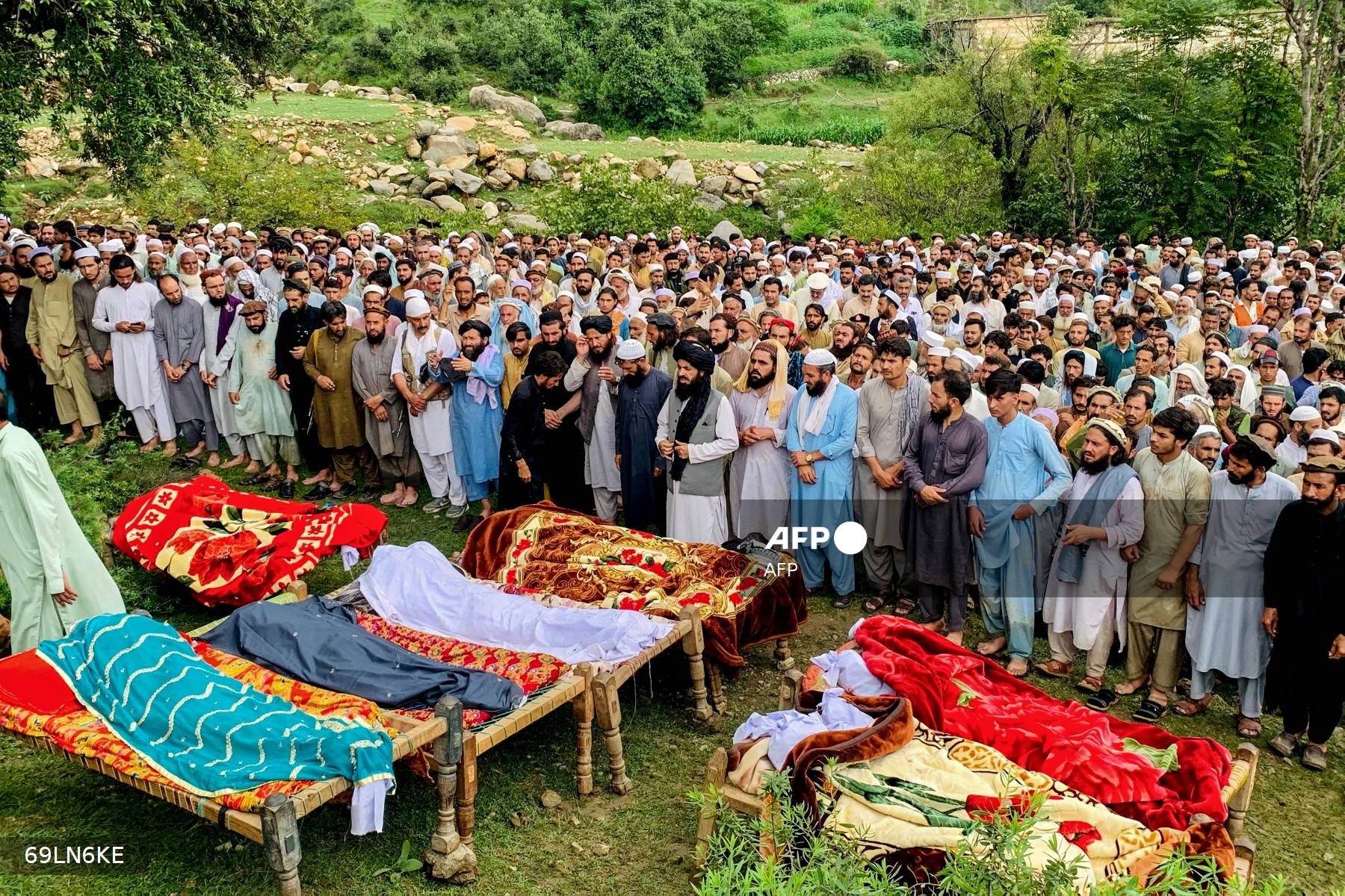 Caption: Mourners and locals offer funeral prayers for victims who died in incidents related to flash floods and monsoon rains in Salarzai Tehsil of Pakistan’s Bajaur district on August 15, 2025