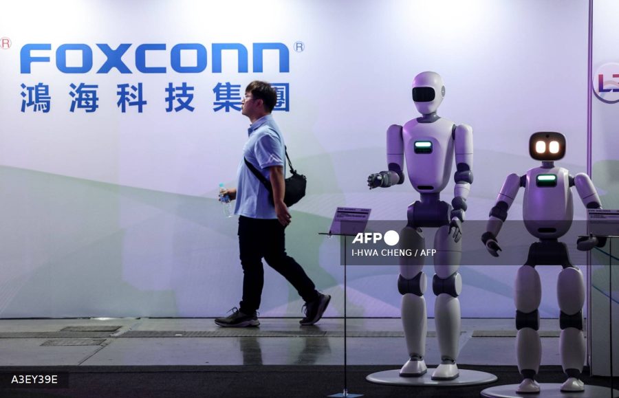 Caption: A man walks past a Foxconn signage and robots on display during the Hon Hai Tech day in Taipei on November 21, 2025.