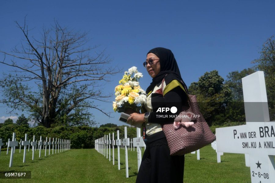 Caption: A woman holds flowers for a ceremony marking the 80th anniversary of the end of World War II, at the Ereveld Pandu cemetery where Dutch soldiers who died in the war are buried in Bandung, West Java.