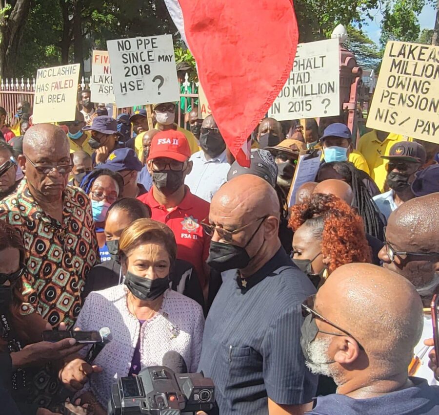 Following a declaration on Labour Day, Sunday, trade union members delivered letters expressing lack of confidence in Dr Rowley to President Paula-Mae Weekes at her St Ann’s Office and then proceeded to the Parliament building to deliver similar letters to Senate President Christine Kangaloo, Speaker of the House of Representatives Bridgid Annisette-George and Persad-Bissessar.