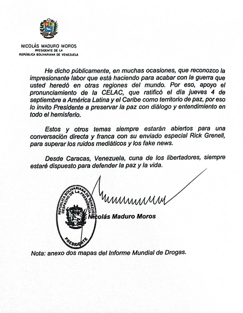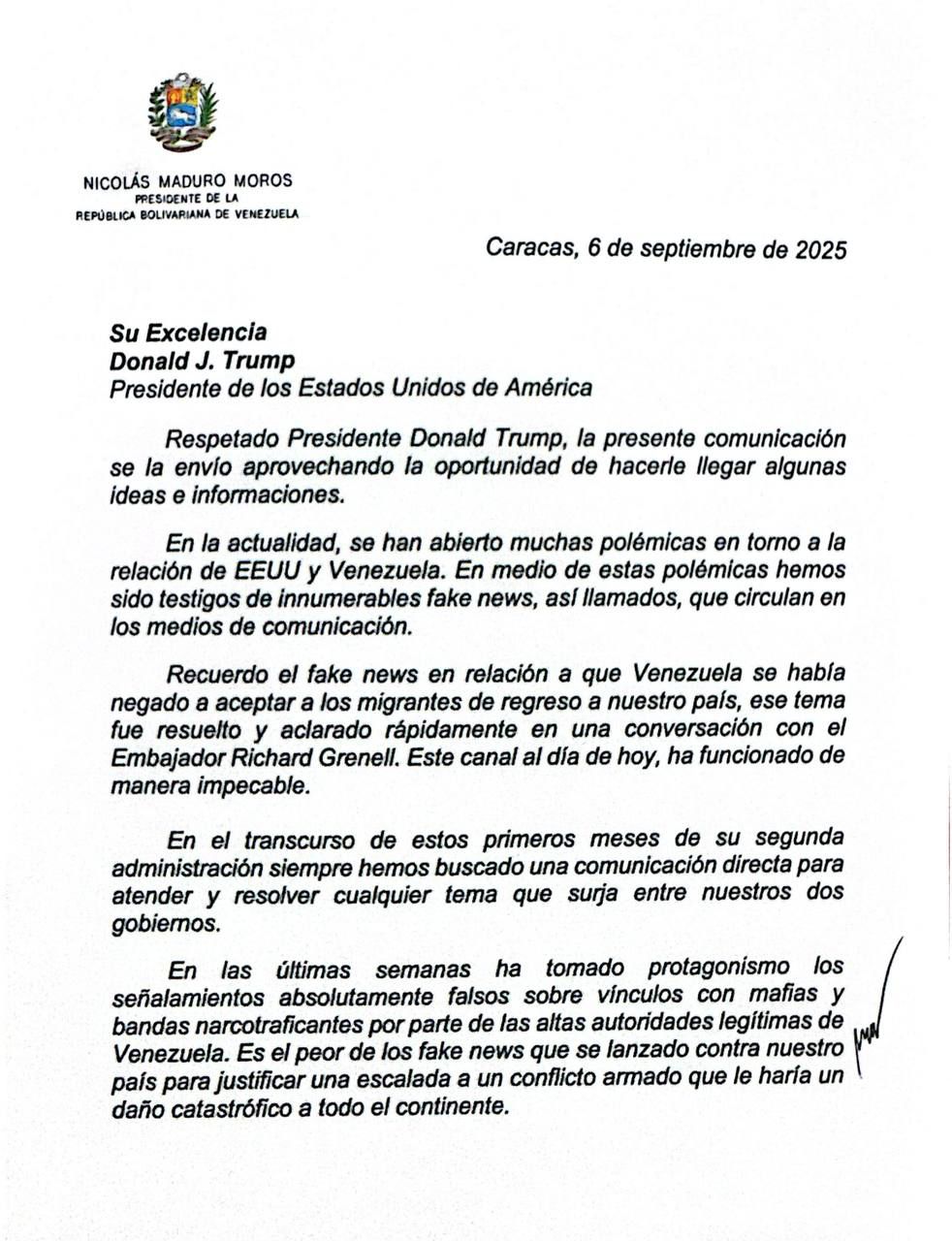 The letter addressed to Trump is dated September 6 and was sent days after the United States deployed warships off the coast of Venezuela and carried out the first of several attacks on Venezuela-based boats alleged by Washington to be carrying drugs.