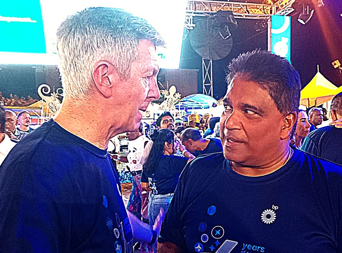 Caption: Energy Minister Dr Roodal Moonilal, right, with Presidnet of bpTT David Campbell at he company’s Pan Yard Lime on Thursday. AZP News/Prior Beharry