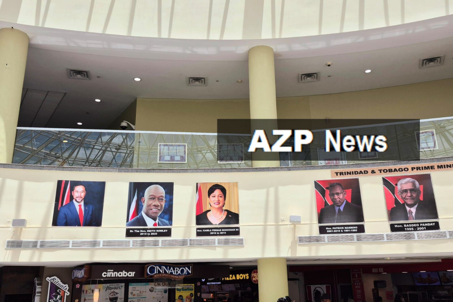 Caption: Photos of prime ministers of Trinidad and Tobago at the Piarco International Airport. AZP News/Azlan Mohammed