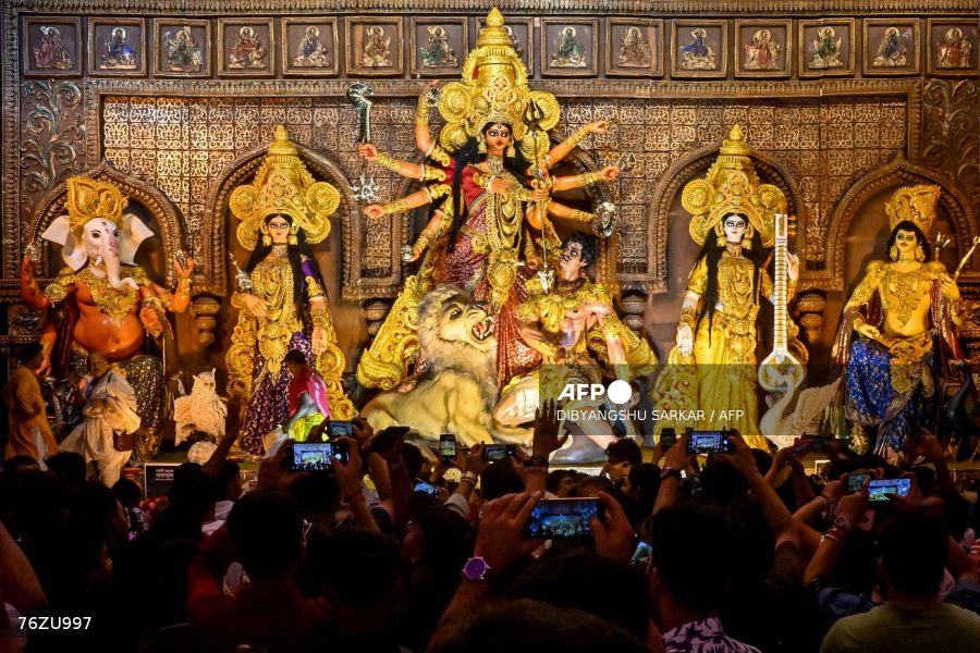 Caption: Devotees take photographs as they visit a 'Pandal' (temporary structure for worship) with an idol of the Hindu goddess Durga on the eve of the 'Durga Puja' festival in Kolkata   KOLKATA - Millions in India's eastern city of Kolkata will draw on millennia-old traditions when they celebrate the Hindu festival of Durga Puja …