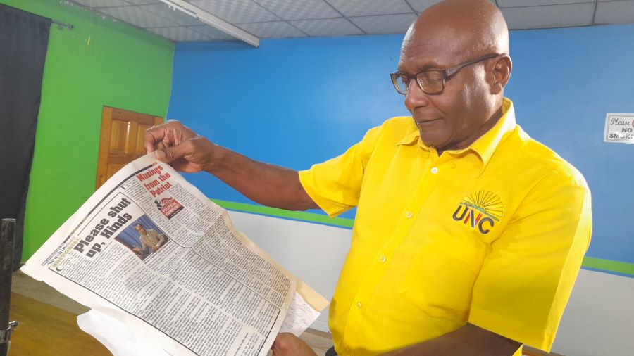 Caption: Member of Parliament for Naparima and supporter of the United Patriots Rodney Charles reads from the Sunshine Newspaper on Thursday night. AZP News/Sue-Ann Wayow