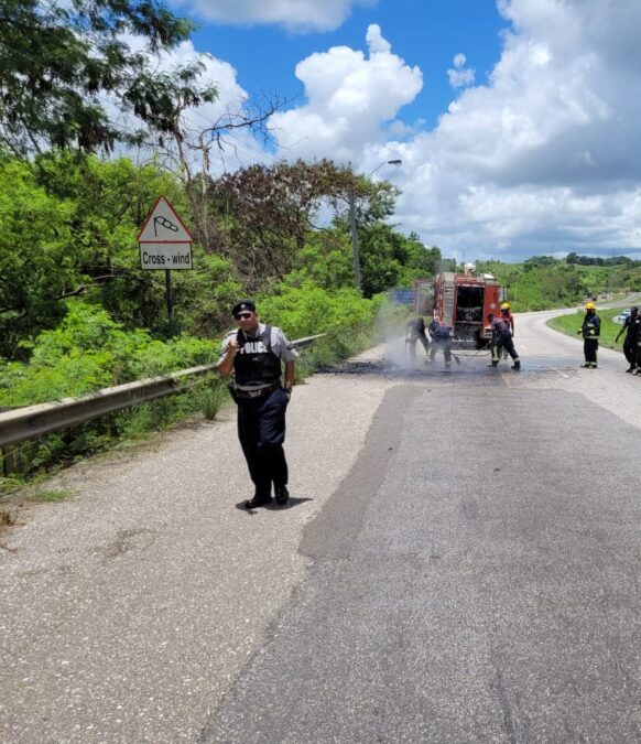 From as early as 3 am persons protesting against the six-month metal export ban, burned tyres and threw sand across the Solomon Hochoy Highway. One man did a video and cautioned other drivers along the route.
